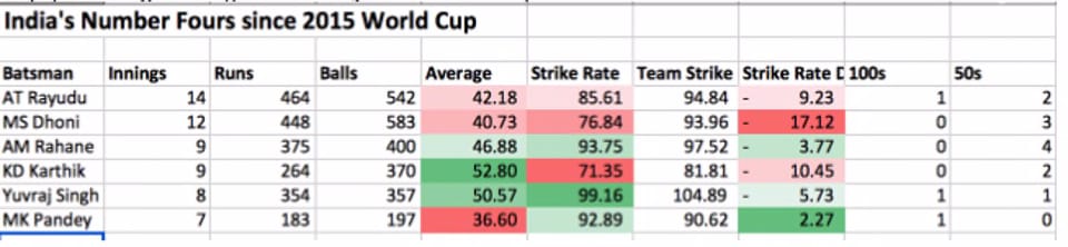 This is a good place to plug my piece for the Hindustan Times on India’s Number Four problem in one day international cricket. I looked at the average, strike rate and “relative strike rate” (player strike rate minus team strike rate) for all the contenders for the number four spot in India’s batting lineup, and an intuitive method to show who had high and low numbers was to use column-wise conditional formatting. To their credit, the HT graphics editors didn’t change my formatting. And this is what it came out as: